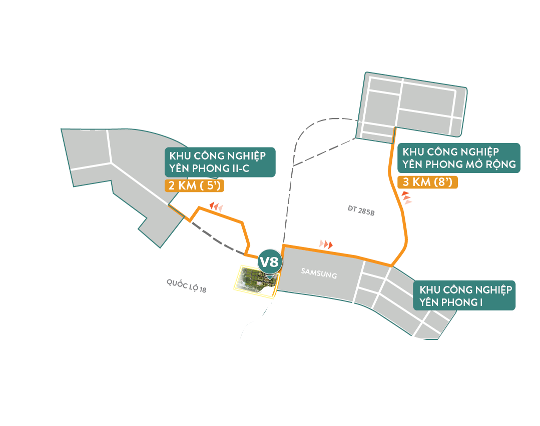 Toà nhà V8 sở hữu vị trí thuận lợi, nằm ngay sát Khu công nghiệp Yên Phong, đối diện nhà máy Samsung, phía sau giáp khu dân cư Ô Cách, cách KCN Yên Phong II-C và KCN Yên Phong mở rộng bán kính 3 km.
